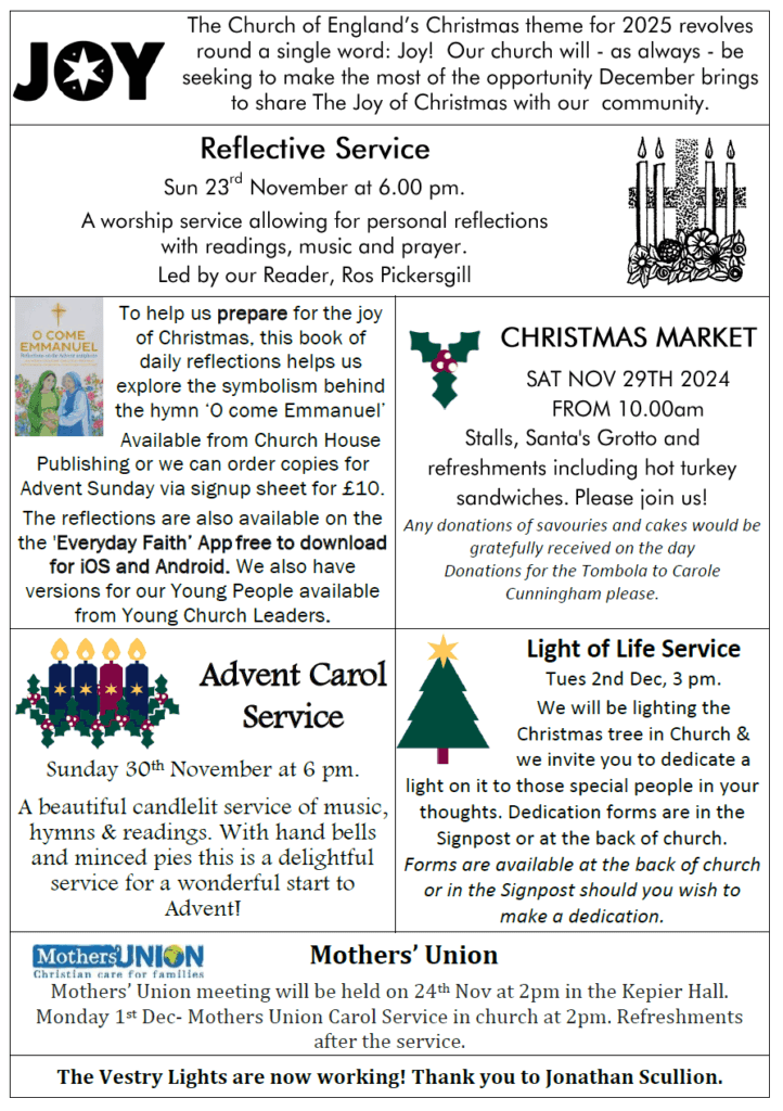 At 6.00 pm our Reader, Ros Pickersgill will lead us in a Reflective Service – A worship service allowing for personal reflections with readings, music and prayer.