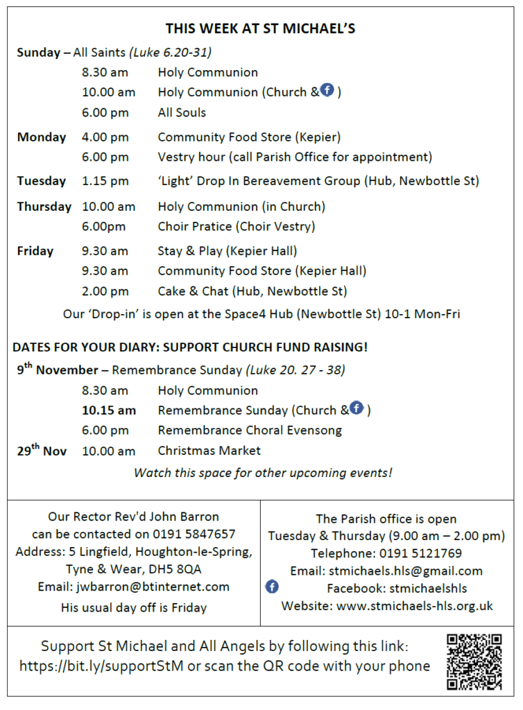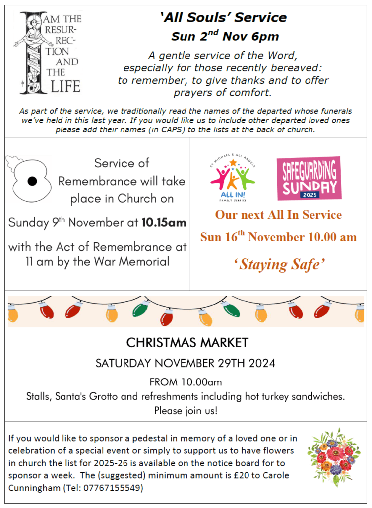 At 6.00 pm Rev’d John Barron with preaching from our Reader, Ros Pickersgill will lead us in ‘All Souls’ Service – A gentle service of the Word, especially for those recently bereaved to remember, to give thanks and to offer prayers of comfort.