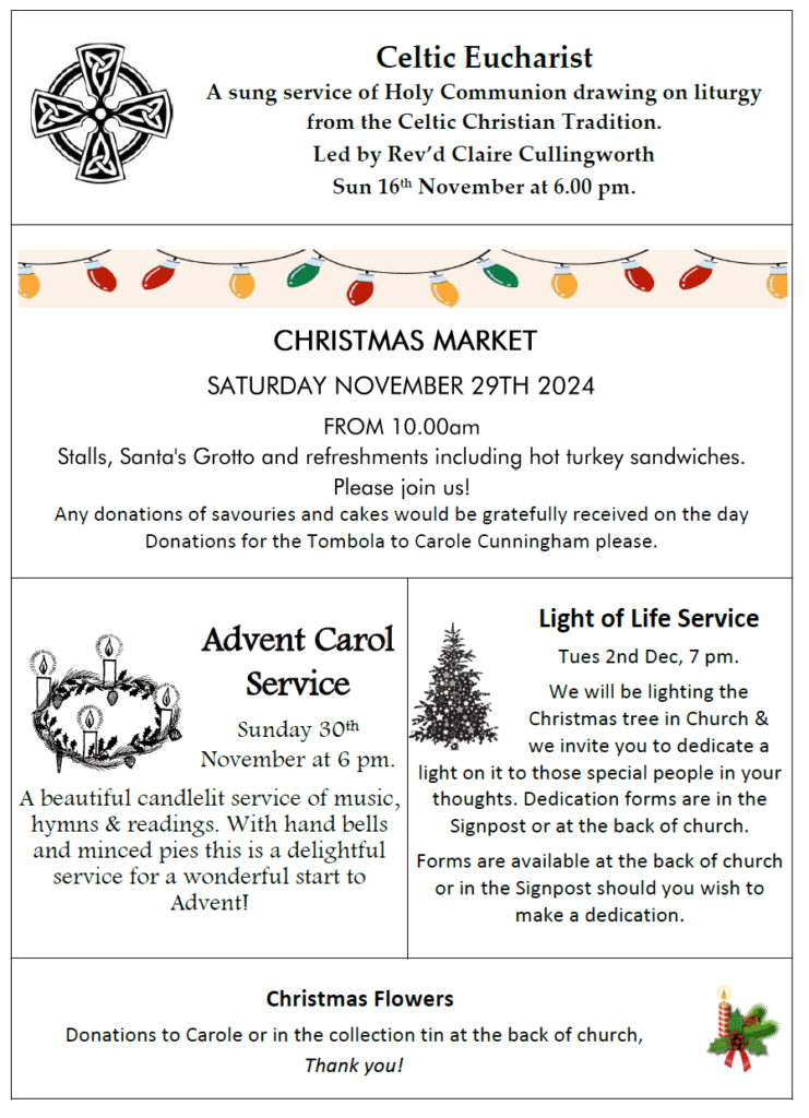 At 6.00 pm Rev’d Claire Cullingworth will lead us in Celtic Eucharist – A sung service of Holy Communion drawing on liturgy from the Celtic Christian Tradition.