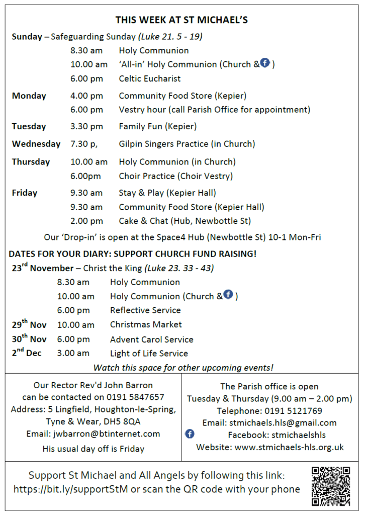 At 10.00 am our ‘All-in’ service of Holy Communion will be led by Rev’d John Barron with our Reade, Anne Clappison.