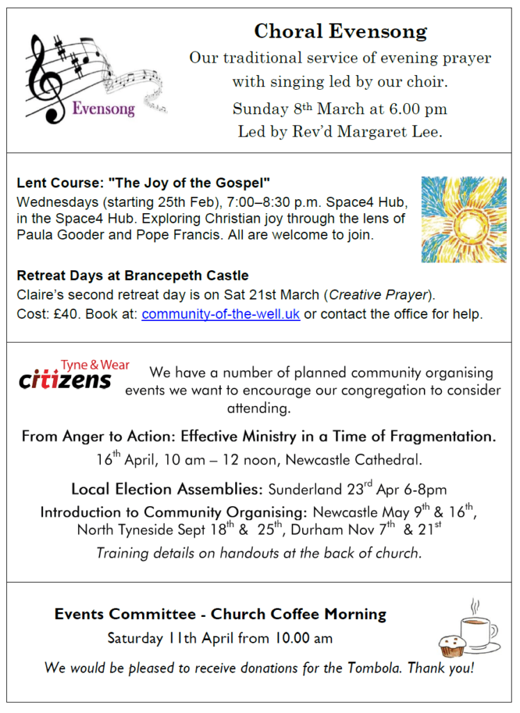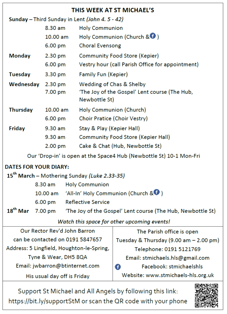 At 10.00 am our Holy Communion Service will be led by Rev’d John Barron and preaching from Rev’d Claire Cullingworth, with Young Church hearing the story of the women at the well.