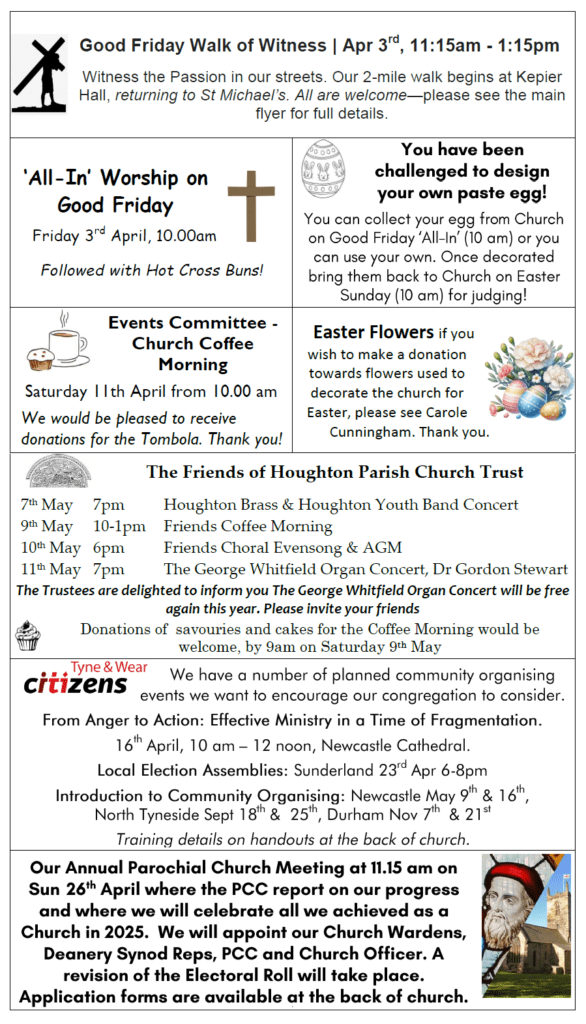 Walking The Way of the Cross at 11:15 am – Retelling the Passion Story in the heart of our community. Join us as we carry the cross from our family service out into the streets, back-alleys, and parks of our parish. This is more than a walk; it is a moving prayer for our town, retracing the 14 scriptural readings of the Passion in the places where we live and work.