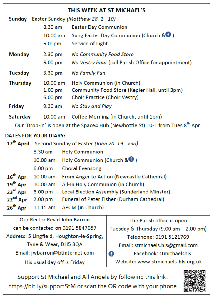 Easter Day Communion Service at 8.30 am will be led by Rev’d John Barron.